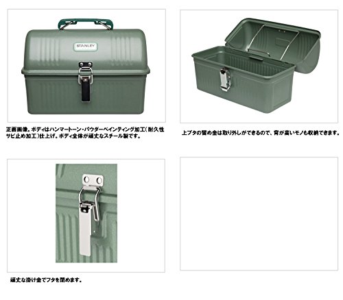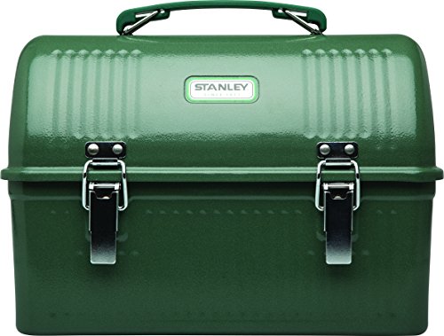 Stanley classic 5.5 Quart hammertoe green lunchbox packs a day's lunch or last night's leftovers in rugged style. This lunch box id also fully packable-all items fit with other Stanley gear and are designed to optimize packing. The 0.6mm SPCD steel give this lunchbox superior durability. Study latches and hinges are for added durability. A domed top and metal bracket keep Stanley vacuum bottle or mug nested in lid.