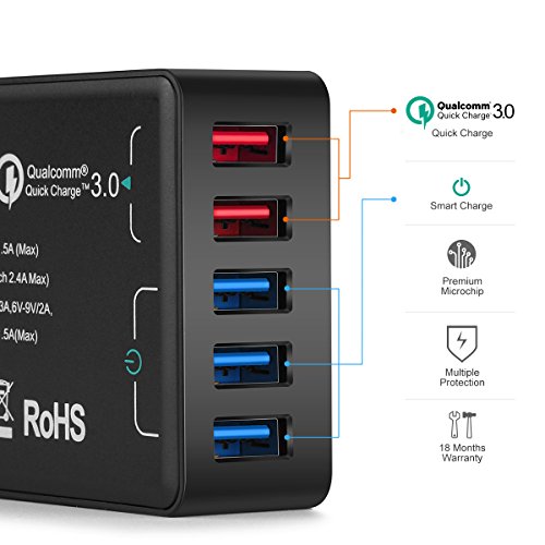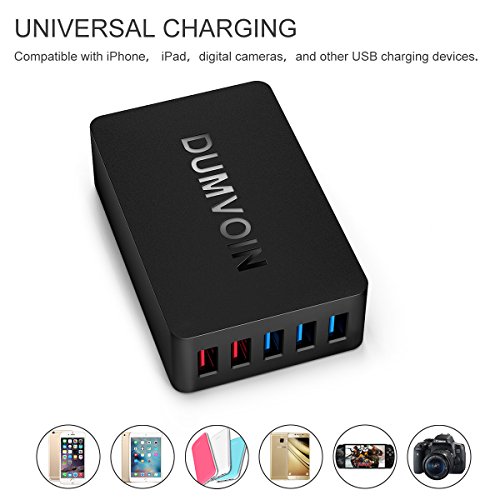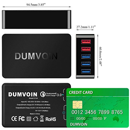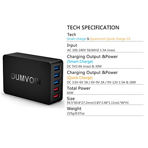 DUMVOIN 66W 5-Port Quick Charger with Dual Qualcomm Quick Charge 3.0 Port (Compatible with QC 2.0) & Smart Port for iPhone 7/7 Plus, iPad Pro/Air 2, Samsung Galaxy S7/Edge, and More