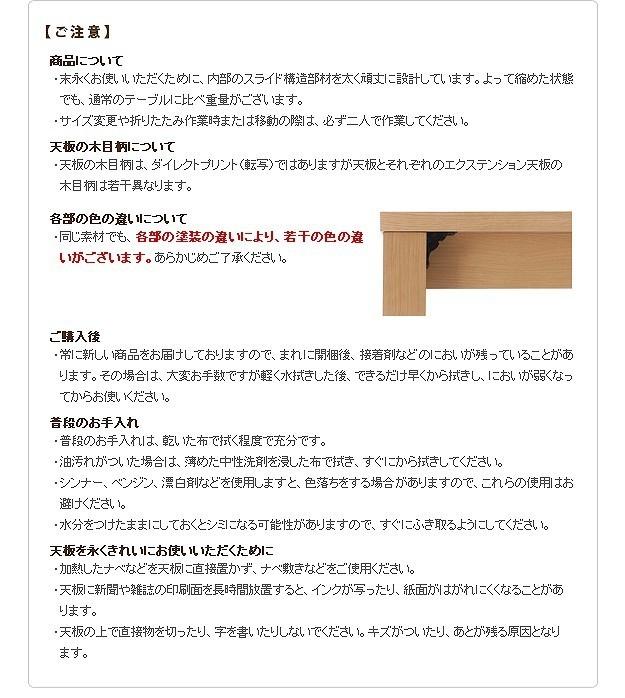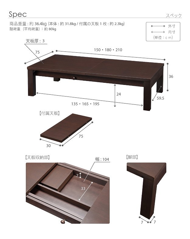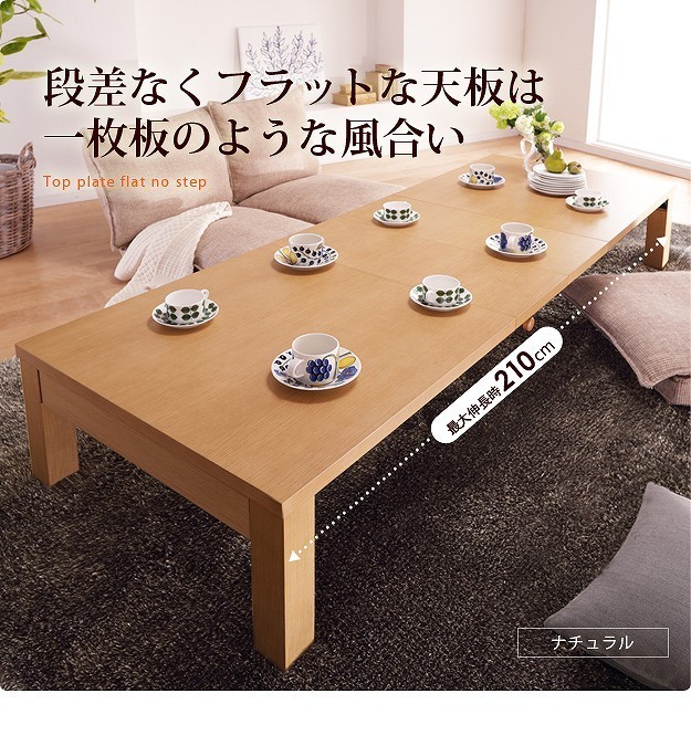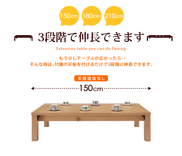 ※メーカー直送のため代金引換はお受けできません。※沖縄・一部離島は別途送料がかかります。お見積もりいたしますのでお問い合わせ下さい。商品について:人数や用途に応じて150→180→210cmの3段階に調節できる伸長テーブル。どっしりと安定感のあるつくりです。天板の両端を引いて真ん中に付属の延長天板をセットするだけの簡単伸長式。ストッパー付きなので伸ばしても、そのまま使っても天板がズレる心配もありません。大きく伸びる本体に対応した構造ですので安全にお使いいただけます。組立不要の折れ脚式☆届いてすぐに使えます。サイズ(cm):幅150/180/210x奥行75x高さ36cm・天板厚30mm重量:約36.4kg(本体-31.8kg・延長天板-2.3kg/枚)耐荷重:約80kgカラー:ダークブラウン・ナチュラル材質:本体-繊維板(転写プリント)、脚部-繊維板・天然木(パイン)、ウレタン塗装延長天板2枚付属完成品メーカー:株式会社ナカムラ(s0900022)