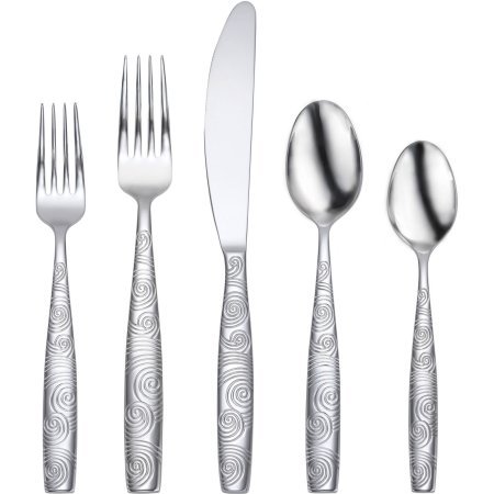 - 20-piece flatware set with service for 4. Set includes 4 each: Salad/dessert fork, place fork, place knife, place spoon, and teaspoon