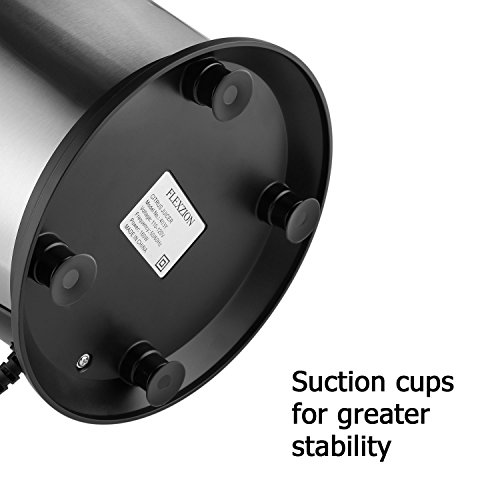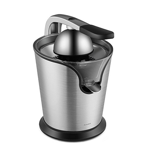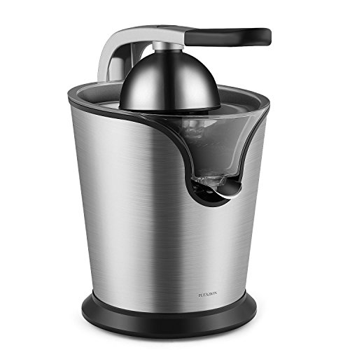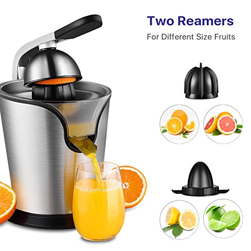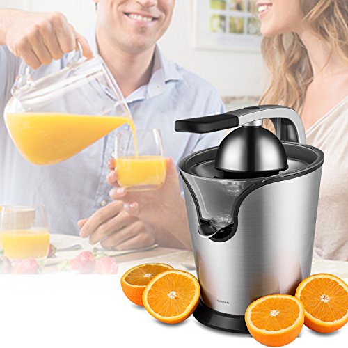 Stainless steel cone and screening filter plate holds each half of the citrus securely and filters out seeds and excess pulp; Motorized citrus juicer with handle and cone lid;