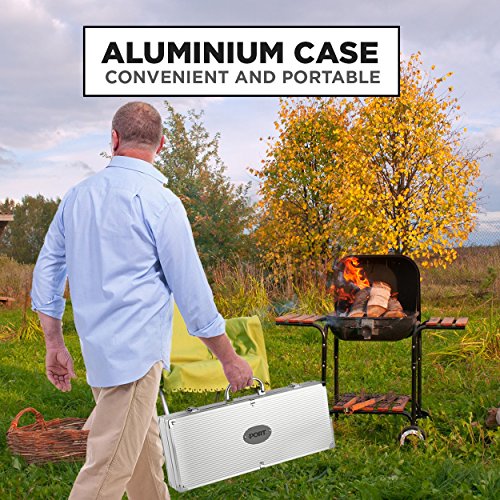 - PREMIUM QUALITY CASE: Along with 18 essential grilling utensils you’ll also receive an aluminum carrying case to keep your tools neatly organized between cooking. The lightweight aluminum carrying case is equipped with latches ensuring proper tool storage and securing the tools at their exact locations.
