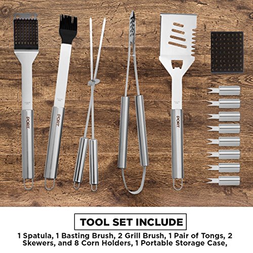 Professional BBQ Grill Kit by PORT: 16-Piece Stainless Steel Barbecue Tool Set | Heavy Duty Grilling Utensils In Portable Aluminum Storage Case | Dishwasher Safe | Ideal Gift