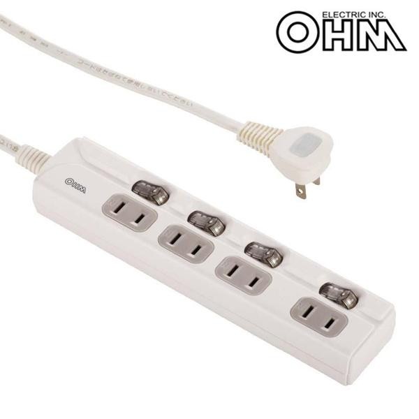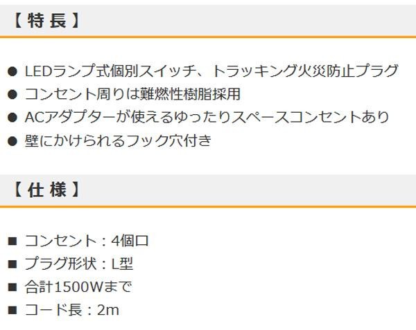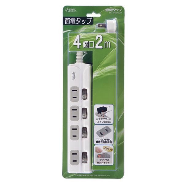 ACアダプターも使えるゆったりスペースコンセントあり。壁にかけられるフック穴付きです。 生産国:中国 ※サプライヤー直送品 ご注文後3~4営業日後の出荷となります【商品名】OHM 節電タップ 4個口 2m HS-TP42A60W