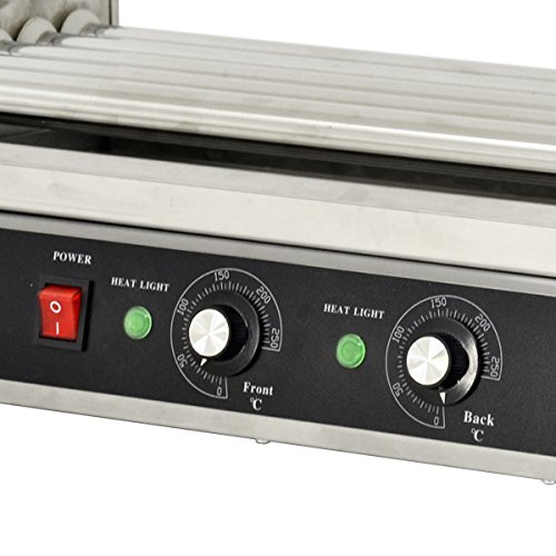 Individual temperature control knobs (0° to 250°C on dial = 32° to 482°F) for front and back; easy to use and clean