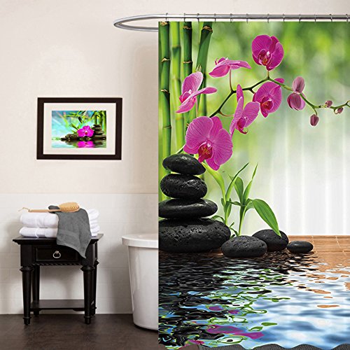 THEME OF SPA DECOR: Asian relaxation with zen massage stones purple orchid and a bamboo pattern.Such as the rendition of "Beside Still Waters".Decorative shower curtains makeover your bathroom and this color scheme, instantly updating any bathroom deco theme and providing an unparalleled, upscale look.