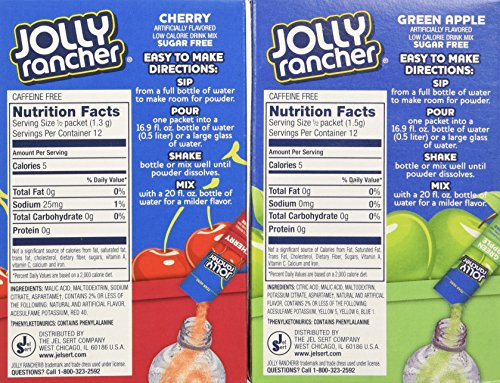 Lot of 12 (6-ct.) Boxes Mixed Variety JOLLY RANCHER ~ 6 Green Apple & 6 Cherry. Singles to Go! Items in Picture are exactly what you will recieve. 6 boxes of Each. Add to 16.9 oz. bottled water. ~Phenyleketonurics: Contains Phenylalanine~ Brand : Jolly Rancher EAN : 0754311215249