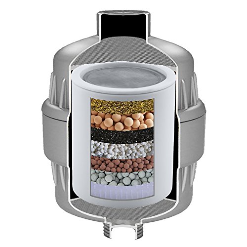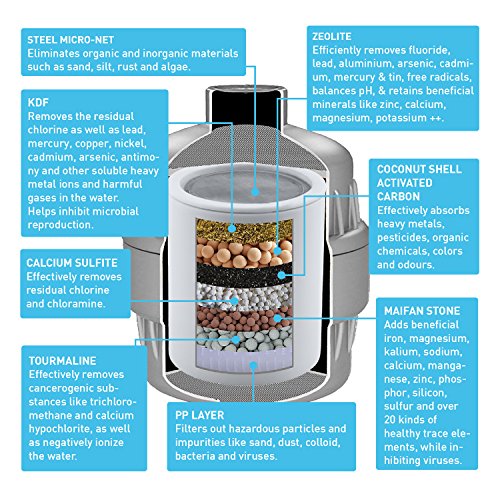 - SUPERIOR 8-STAGE FILTER CARTRIDGE – 100% NATURAL ZEOLITE CRYSTAL, KDF, COCONUT SHELL ACTIVATED CARBON, & CALCIUM SULFITE effectively removes fluoride, chlorine, chloramine, pesticides, & heavy metals including arsenic, lead, mercury & aluminium, while balancing pH & retaining beneficial minerals.