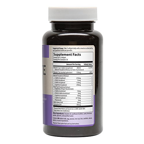 -. Feature : ALL NATURAL VITAMIN E: Complete E is a full spectrum Vitamin E supplement with natural Tocopherols, Tocotrienols, Alpha Lipoic Acid and Vitamin C. Vitamin E is a potent antioxidant that naturally occurs in many forms. / SUPPORTS IMMUNE FUNCTION: It supports immune function as well as skin and eye health. Vitamin E naturally occurs in nuts and seeds, but it is sometimes hard to get a sufficient amount of Vitamin E through diet alone. / CONTAINS EIGHT NATURALLY OCCURING FORM OF VITAMIN E: Our Complete E supplement is a comprehensive formula that provides all eight naturally occurring forms of Vitamin E in both tocopherol and tocotrienol forms. / INSPIRED BY NATURE, SUPPORTED BY SCIENCE: Our goal is to provide consumers with products sourced with the highest quality ingredients, verified by third party evaluation. We are committed to Non-GMO, organic, gluten-free and vegan certifications. / OUR MISSION: Our staff of highly trained professionals is committed and passionate about the development of innovative nutritional supplements that reflect sound, clinical experimental data collection, interpretation and application.