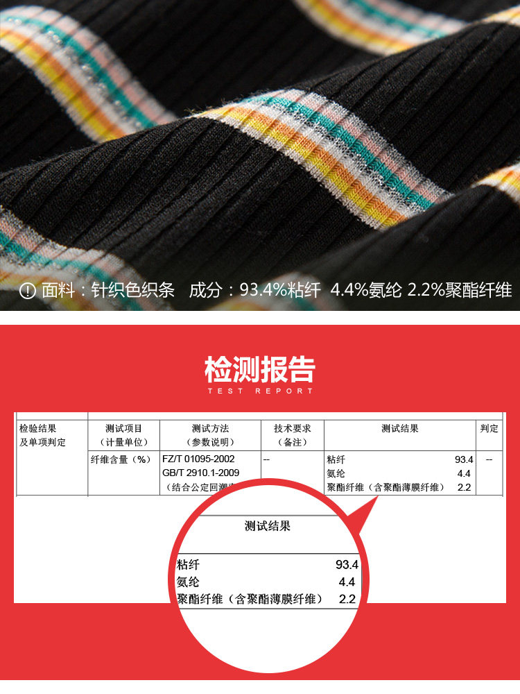 | 主 料:93.4%粘纤 4.4%氨纶2.2%聚酯纤维(含聚酯薄膜纤维)颜 色:黑色 |