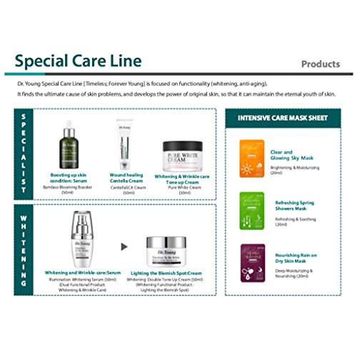 -. Binding : Misc. -. Brand : Dr. Young -. EAN : 0887406053713 -. Feature : It's a double function day cream makes your skin look brighter instantly. / It has whitening and wrinkle care function with Niacinamide and Adenosine. / Niacinamide makes skin look bright by reducing melanin and Adenosine strengthens skin by controlling wrinkles and fine lines. Also, Centella Asiatica Extract boosts radiance while protecting and hydrating skin. / Just with this step, you can express clear skin tone immediately. / How to Use : As the final step of your day skin care, apply moderate amount to entire your face as a moisturizer and tap until it is absorbed. It can be used to express bright skin tone on other parts of the body. -. IsAdultProduct : 0 -. Label : Dr. Young -. Manufacturer : Dr. Young -. MPN : B01KHDYY10 -. PackageQuantity : 1 -. PartNumber : B01KHDYY10 -. ProductGroup : Beauty -. ProductTypeName : BEAUTY -. Publisher : Dr. Young -. Studio : Dr. Young -. Title : [Dr. Young] Special Care Pure White Cream 50ml - Tone up Cream - Whitening & Wrinkle Care -. UPC : 887406053713