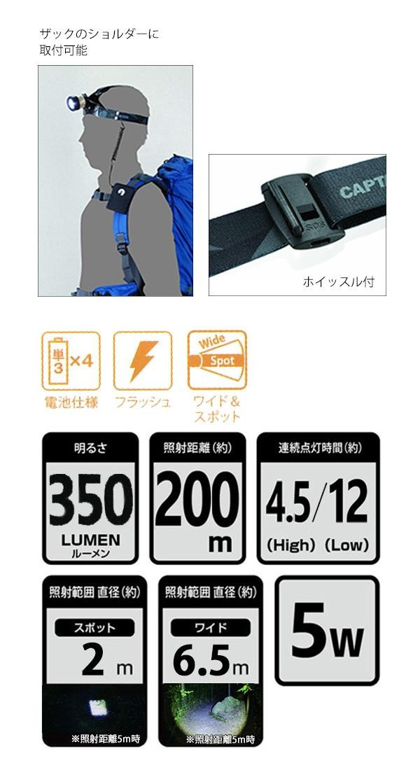| 仕様 | 光源:チップ型LED(発光ダイオード)1個 電源:DC6V 単3形乾電池4個(別売) 電池寿命(約)/HIGH:4.5時間、LOW:12時間、フラッシュ:12時間、SOS:12時間(アルカリ乾電池使用時)※使用状況により異なる 明るさ:350ルーメン(MAX) 照射距離:約200m |