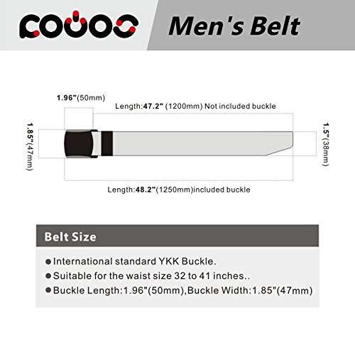 Suitable for the waist size 32 to 41 inches. The total length is 125cm(49.2 Inch), strap width is 3.8 cm(1.49 Inch). Buckle length: 5 cm(1.96 Inch), Buckle Width:4.7cm(1.85 Inch)