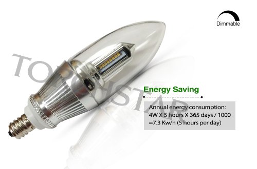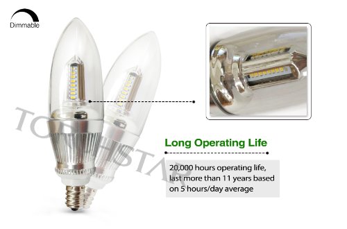 - Feature : 20,000 hours operating life, last more than 11 years based on 5 hours/day average / Annual energy consumption: 4W X 5 hours X 365 days / 1000=7.3 Kw/h / 4W LED equivalent to 40W incandescent candle light, perfect replacement and save on electric bill / Soft warm white halogen-like LED light, no dazzle light to the eye / High quality Aviation Alumina lamp body, Nickel finished lamp base