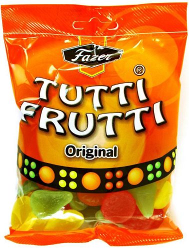 -. Feature : Imported from Finland. / Fazer Tutti Frutti gummy candies are a fresh fruity flavor mix of raspberry, pear, lemon and orange. / Size: 160g, 5.6 OZ Bag