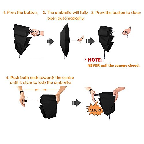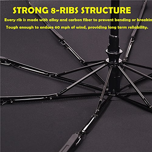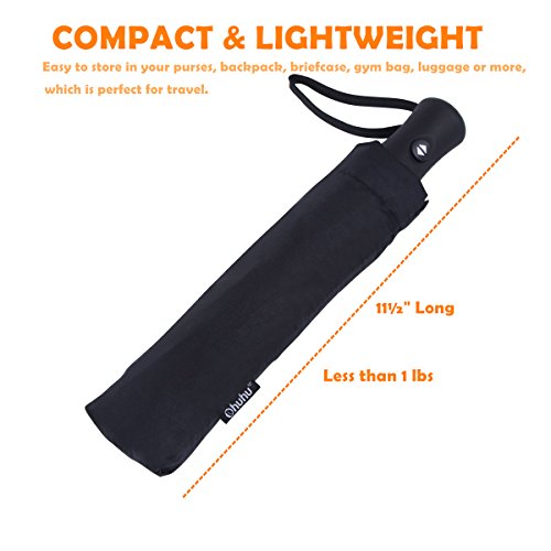 -. Brand : Ohuhu -. Feature : STRONG 8-RIBS: Each and every rib is made with alloy and carbon fiber to prevent bending or breaking / WINDPROOF, HEAVY DUTY 60MPH: Tough enough to endure 60 mph of wind, providing long term reliability that you can count on / SUPERIOR WATER-REPELLENT: Coated with waterproof DuPont Teflon Technology, made with soft and durable 210T polyester fabric compared to standard umbrellas which use a 190T polyester fabric. All raindrops bounce and/or rolls off smoothly, protecting you against the rain / AUTO OPEN & CLOSE CANOPY IN SECONDS: With a push of a button, the umbrella automatically opens and closes. Great for quick entry into a car, building, or tent. Easy and simple to use with just 1 hand / COMPACT & LIGHTWEIGHT: This compact umbrella weighs less than 1lb, making it perfect for travel. It is 11?" long and easy to store in your purses, backpack, briefcase, gym bag, lage or more -. ProductGroup : Apparel -. ProductTypeName : LAGE -. Title : Ohuhu Auto Travel Umbrellas, 60 MPH Windproof, Auto Open and Close, Compact