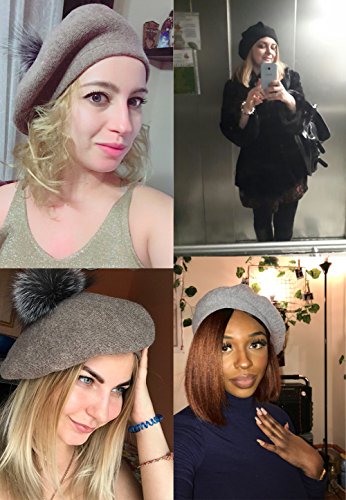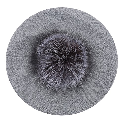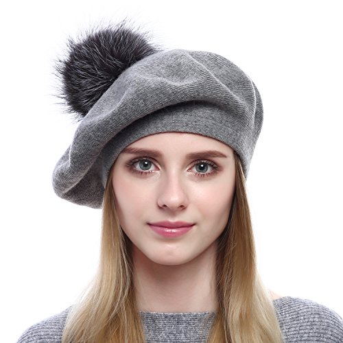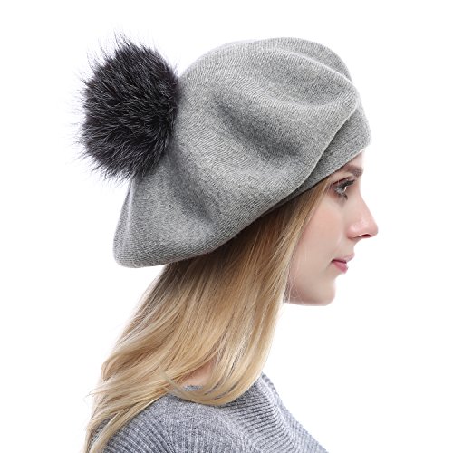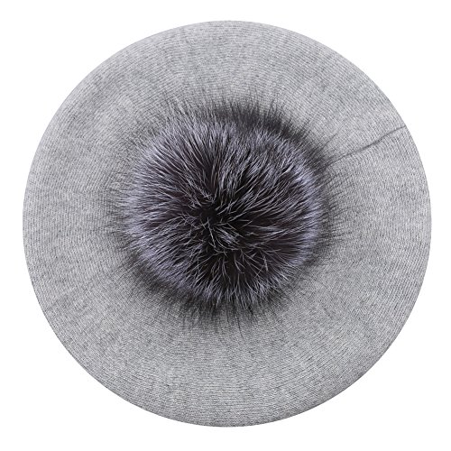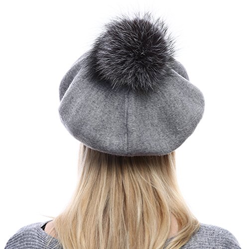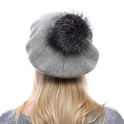 Women Wool Beret - Real Silver Fox Fur Pom Pom Beanies Winter Knit Cashmere Hats
