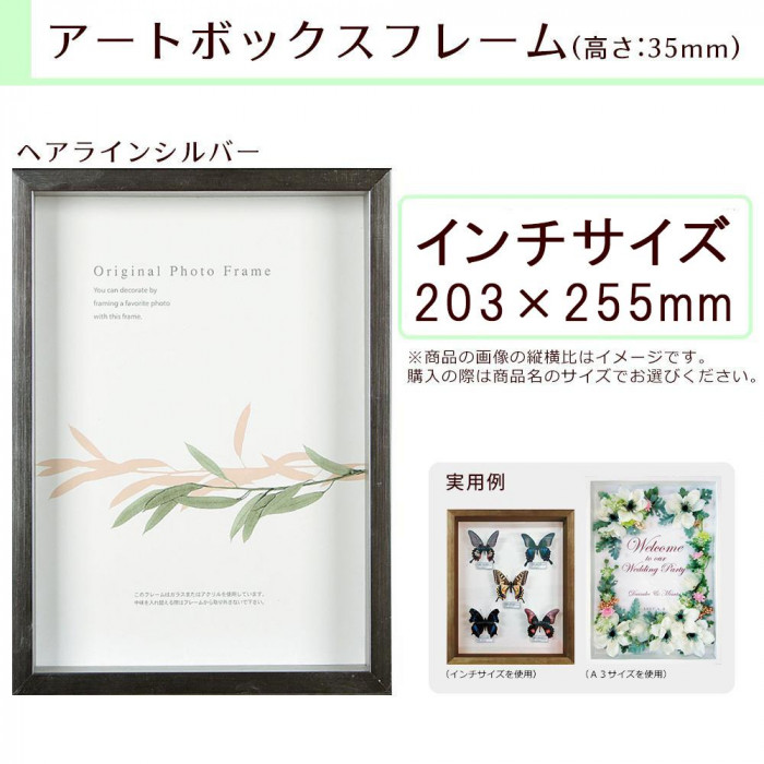深さ25ミリの立体の木製額。フィギュアBOXとして、フラワーアレンジメントやウェディングボードとしても最適。 製造国:日本 素材・材質:フレーム:木、前面:ガラス 重量:約660g 仕様:規格:インチ(203×255mm) 付属品:紐 ※サプライヤー直送品 ご注文後9~12営業日後の出荷となります【商品名】A.P.J. BOXフレーム アートボックスフレーム(高さ:35mm) インチサイズ(203×255mm) ヘアラインシルバー 0021768528