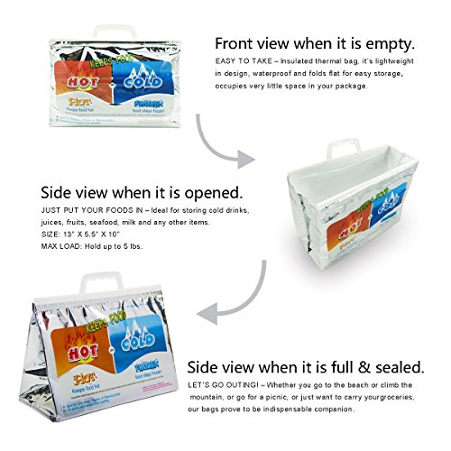 - KEEP FOOD AT DESIRED TEMPERATURE FOR HOURS – These hot cold bags are an ideal solution to keep your warm food warm and cold food cold for hours, be it seafood, fruits, drinks, milk, sandwiches, pizza, salads or other things. Whether you want to go for beach picnic or just want to carry your groceries, these bags prove to be good companion. Moreover, the bags are extremely durable yet inexpensive!