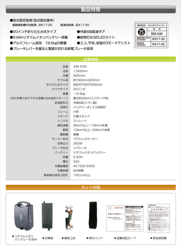 ●仕様:アシスト機能・折畳みフレーム・折畳みハンドル・6段変速・LEDライト