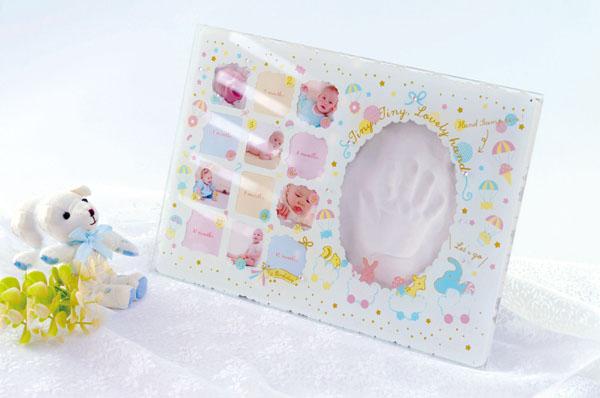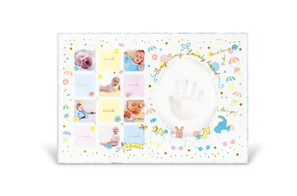 | 一面に散りばめられたラインストーンと可愛らしい色使いが、とっても楽しいフォトフレームです。産まれてから1 2ヶ月の写真と共に、付属の粘土で取った手型を飾ることができます。 |