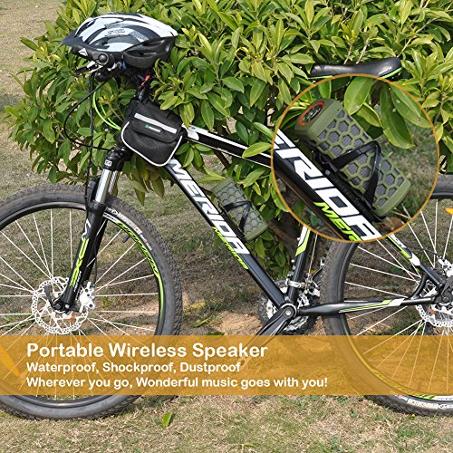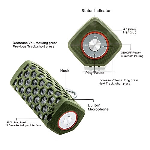 Feature : Bluetooth CSR 4.0 technology: Connect speaker with a wireless range up to 33 feet away from your bluetooth devices such as iPhone, iPad, Samsung Galaxy S4/S5, Galaxy Note, Sony Xperia, Nokia Lumia, Amazon Kindle Fire HD, Amazon Fire Phone, HTC One, Nexus 7, Nexus 4, Microsoft Surface plus Tablets, Smart Phones and More.( NOTE:3.5mm Aux-in to connect directly to any non-Bluetooth device) / Wonderful Sound: 10-watts(2*5W) drivers offer full high-definition surround sound. 2.0 sound track audio deliver rich and comfortable listening experience. Enhanced bass and high-fidelity audio, enjoy the music at all frequency with pleasure. / Power Bank and Long-lasting playtime: built-in 7000mAh Rechargeable Lithium Battery for up to 20 hours playtime and quickly recharge your cell phone or tablet. / Waterproof Dustproof and Shockproof: durable rugged with rubberized covering and strong metal mesh, The portability is endless, great for indoor, outdoor, sport, camping, hiking, climbing, riding etc. / Hands-free calls: built-in HD microphone, It allows you to make hands-free calls easily.