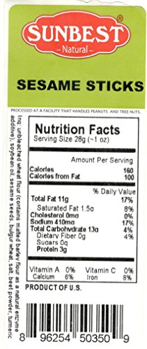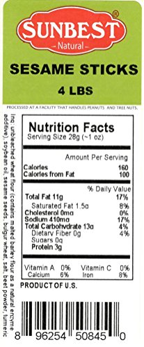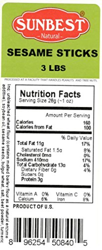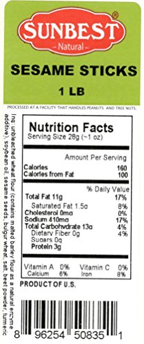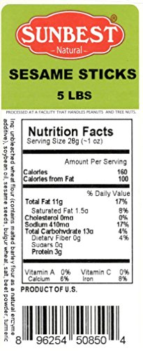 -. Feature : SUNBEST All Natural and Healthy Everything Sesame Sticks in Resealable Bag, Lightly salted. / Health Benefits: Contains fiber, vitamins, unsaturated fat, proteins and minerals / Ingredients: Unbleached Wheat Flour, Soybean Oil, Sesame Seeds, Bulgur Wheat, Salt, Beet Powder, and Turmeric. ( Contains Malted Barley Flour as a Natural Enzyme additive) / Great for snacking, topping, or baking. Delicious, crunchy, and always fresh / OK Kosher Certified
