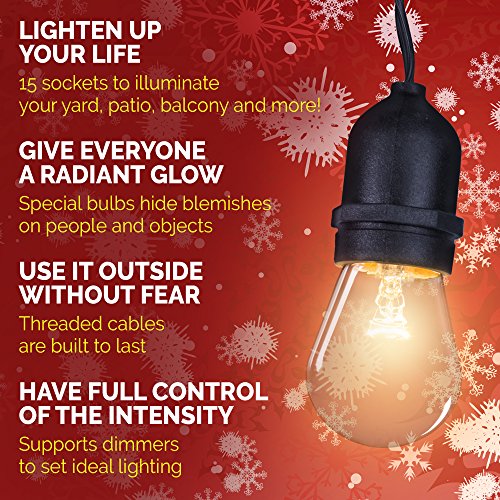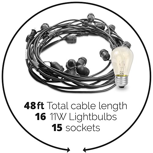 SETUP A PERFECT LIGHT DISPLAY IN MOMENTS - EASY, NO HASSLE INSTALLATION: Each socket of our patio lights is designed and reinforced to allow for simple installation. Hanging these seasonal outdoor string lights requires minimal tools. The Royal Light set comes standard with 48 ft, but you can easily chain together up to 8 string sets that will cover most normal sized backyards, patios or decks. These lamps are waterproof allowing them to withstand the rigors of outdoor use season after season.