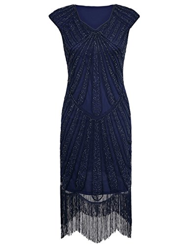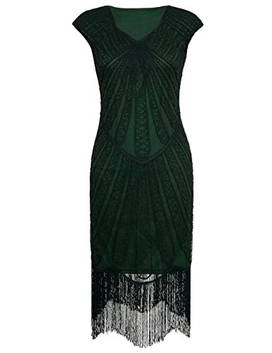 A vintage shift shape design,with a square U pattern neckline,featuring charming cap sleeve.Art deco large quantity of beaded and rope throughout the dress,express fractal ,delicate and intricate designs. Seeming disorderly and irregular,but the overall layout is very harmonious,fantastic. No sequin deco,but the plentiful decoration makes the dress looks rich and flapper. And it's worth mentioning that the decorations are embellished in the lace fabric in the color black dress,looks more elgeant and charming.The sway fringed hemline move with steps,catching the eyes while your 1920s gatsby party.Feature