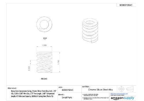 Heavy Duty Compression Spring, Chrome Silicon Steel Alloy, Inch, 1.25" OD, 0.200 x 0.286" Wire Size, 1.75" Free Length, 1.487" Compressed Length, 477.6lbs Load Capacity, 1816lbs/in Spring Rate (Pack of 5)