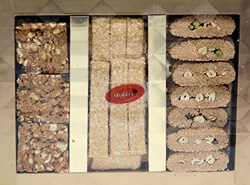 -. Feature : Ingredients (Peanut Brittle): Ground nut (deskinned), Sugar, Jaggery, Clarified butter, Cardamom, Sodium bicarbonate, Citric acid. (Sesame Seed Bar): Sugar, Sesame Seeds, Jaggery, Clarified Butter, Citric Acid (Preservative). (Sesame Seed Bar with Dry Fruit): Cashew Pistachio, Sugar, Sesame Seeds, Jaggery, Clarified Butter, Citric Acid (Preservative). / Nutrition Facts (Peanut Brittle): Each serving size of 40g with 6 servings per container would make up to 217 cal (Protein 7g). (Sesame Seed Bar): Each serving size of 40g with 10 servings per container would make up to 192 cal (Protein 2g). (Sesame Seed Bar with Dry Fruit): Each serving size of 40g with 6 servings per container would make up to 219 cal (Protein 4g). / Delicately crisp, unusually crunchy, crackly texture and a finishing savor of roasted sesame seeds with dry fruits assorted pack will be a perfect pack to gift for any festival or while celebrating occasions / Allergen Advice: All bars are manufactured on same equipment that processes seeds and nuts / Great morning or afternoon snack - All Time Adult and Kids favorite - You just can't have one.