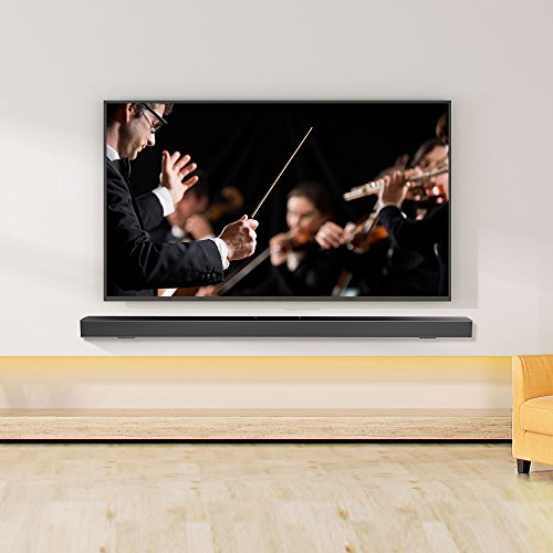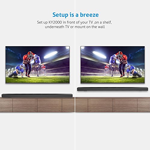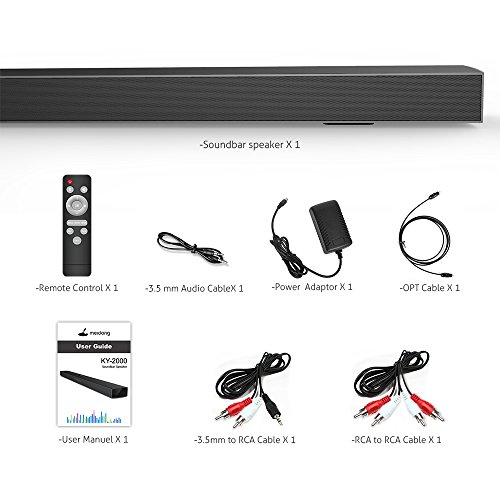 LARGE SIZE 43 INCH- Soundbar KY-2000 has the large size 1100*110*50mm, that can better match 50 inch or larger TV and it is 2.0 Channel with wireless remote control. The shell of the soundbars for tv is made of solid, compact aluminum alloy with clear sound that makes the room-filling home theater sound.