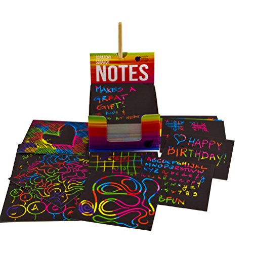 MAGIC DOODLE PAPER Maybe it's not true magic, but there's more than meets the eye. These note cards look basic at first glance, but the surprise is a fun, rainbow drop layer hidden underneath the black matte coating. Use one of the two included wooden stylus pens to scratch off the top layer and reveal it, whether you're just doodling or putting together a to-do list. MANY USES This versatile rainbow background scratch paper is perfect for everything from reminder notes to arts and crafts. Send a unique thank you, leave a love note on the refrigerator, or put an inspirational message in your child's lunch box. Make a grocery list, write down a phone number or play a game of tic tac toe. The list of possibilities is long! STYLISH DESIGN These colorful, fun, eye-catching rainbow drop notes are as cute as they are fun. They come in a rainbow colored desktop dispenser that is handy and convenient. Tuck the cover flap behind the notes to reveal a slot that holds a stylus.