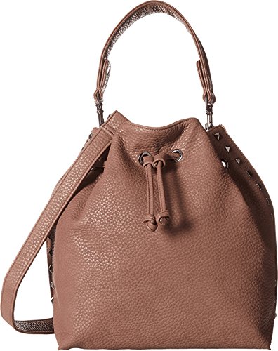 Magnetic snap closure with additional drawstring security. Removable carry handle and removable crossbody strap. Exterior features pyramid stud detail and tonal stitching. Flat base. Lined interior flaunts back wall zip pocket an two slip pockets. Imported.