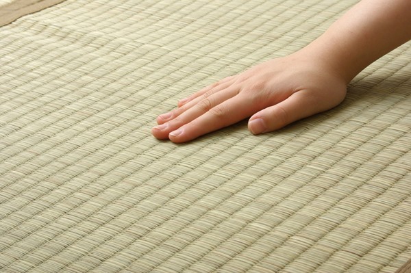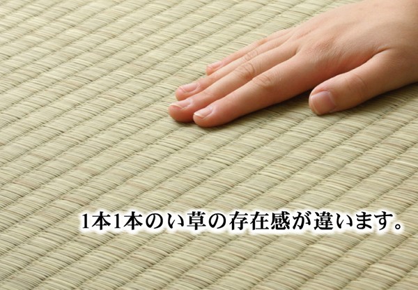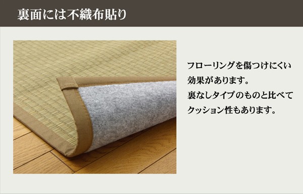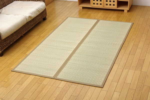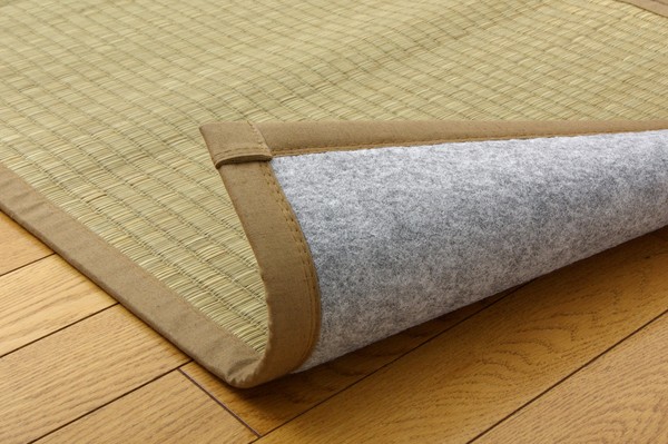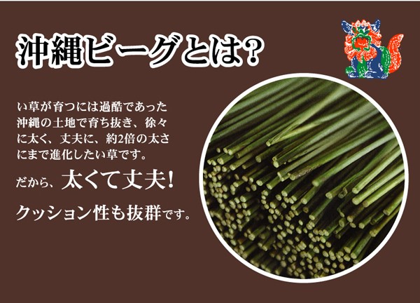 非常に希少価値の高い生地、「沖縄ビーグ」を使用したラグです。沖縄ビーグは通常のい草を原種としますが、何年もかけて沖縄の過酷な環境に適応した結果、太く丈夫に育ったい草の事を言います。本土のい草と比べ太さが2~3倍、重量も2倍程あり丈夫で長持ちします。その為い草特有の機能である湿気の吸放出効果も2倍程となり、夏場のムシムシとした湿り気を吸収してくれる他、寝転がった時の汗のべとつき感の無さも抜群です。長年仕様すると徐々に表面がきれいな飴色に変わり、まるでワックスをかけたかのような光沢感が生まれるのも特徴です。又、一番の特徴はその希少価値です。沖縄でしか生産は出来ず、作付面積もごく僅か、まず本土の店頭で入手する事は出来ません。裏地にはフローリングを気づ付けにくい様、滑り止め加工をした不織布を貼っています。匠の技が光る希少価値の高い一品、「良い物を長く使いたい」、「人とは違った物を使いたい」そんなあなたにピッタリの逸品です。