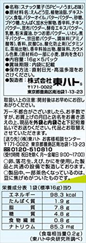 原材料:えんどう豆、植物油脂、デキストリン、食塩、バターオイル、バターパウダー、砂糖、ブドウ糖、たんぱく加水分解物、香辛料、チキンパウダー、昆布パウダー、酵母エキスパウダー、乳糖、粉末醤油、かつお節パウダー、いわし煮干パウダー、宗田節パウダー、調味料(アミノ酸等)、香料、炭酸Ca、酸化防止剤(ビタミンE、茶抽出物)、香辛料抽出物、酸味料、カラメル色素、(原材料の一部に小麦、豚肉を含む)