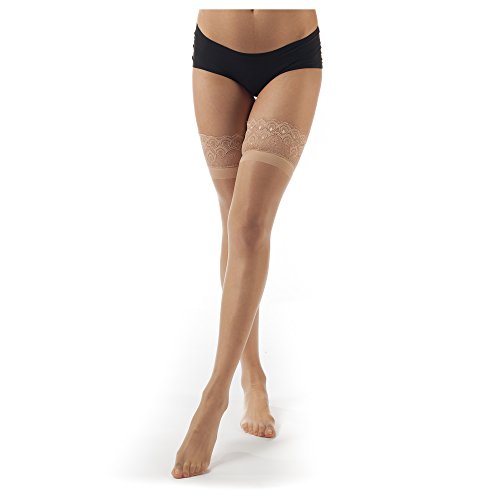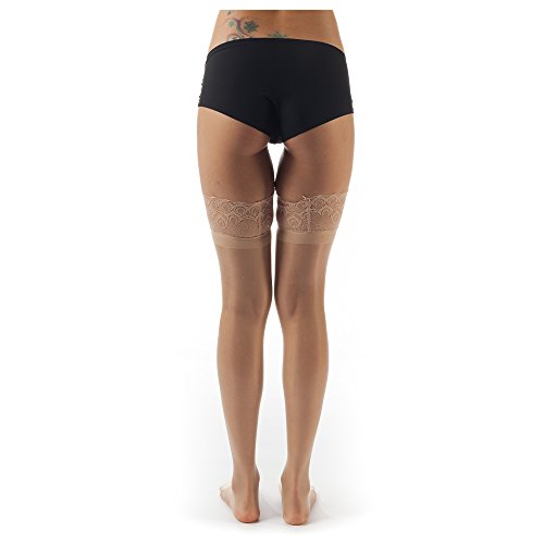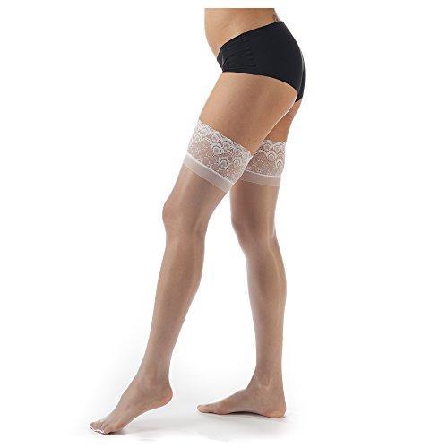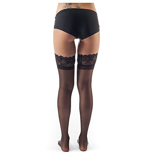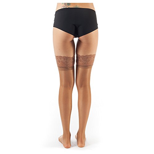 -. Feature : Colors: Black, Beige, Brown, Grey, White / Size: One size fits height: 4'9"-5'7" / Thickness: 15 Denier Hold Ups / Material: 85% Nylon with 15% Spandex / Silky, ultra-smooth, shiny and durable hosiery provides elegant luster to your legs;Silicone lacy top grips thigh for stay up.