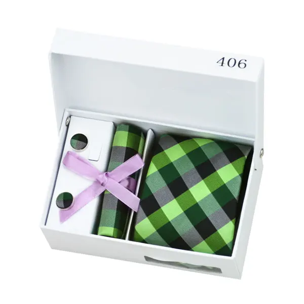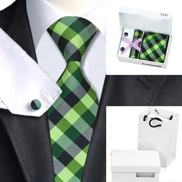 남성 녹색 블랙 격자 무늬 실크 자카드 넥타이 손수건 커프스 단추 선물 상자 가방 세트 비즈니스 웨딩 파티 남성 넥타이 B-406 ![]()