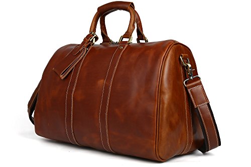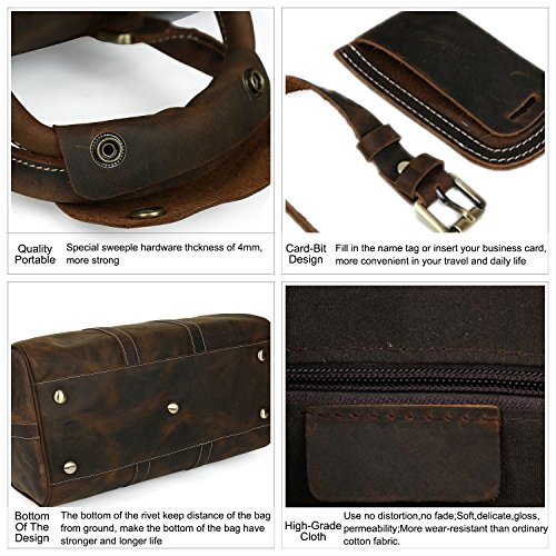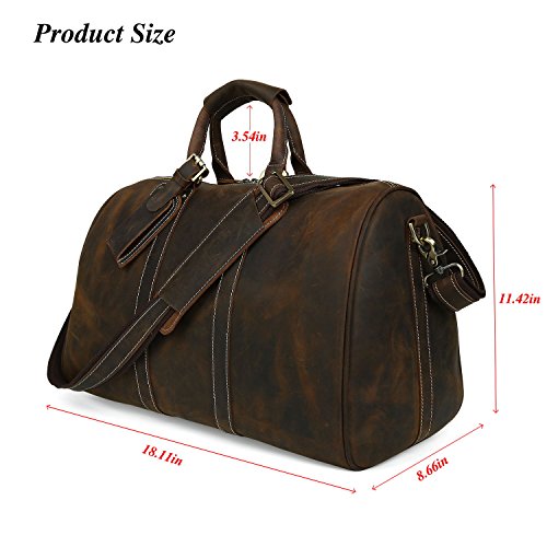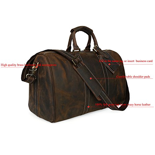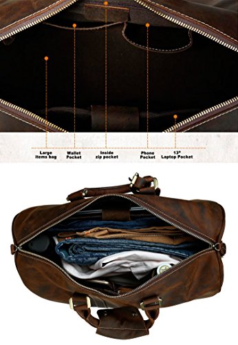 -. Feature : 17.9"l x8.6"w x11.3"h;large duffle for 2-3 overnights business travel / Interior include 1 laptop compartment, 1 zippered pocket, 3 open pockets for pens, cellphone and cards / With detachable and adjustable shoulder straps for comfortable wearing, no compression feeling at all;High quality brass hardwear and accesspoies,sturdy and durable in use / 100% full grain top layer crazy horse leather with cotton as interior lining,both in vintage style and high quality / Lage tag:Fill in the name tag or insert your business card. Perfect gift for frequent travelers