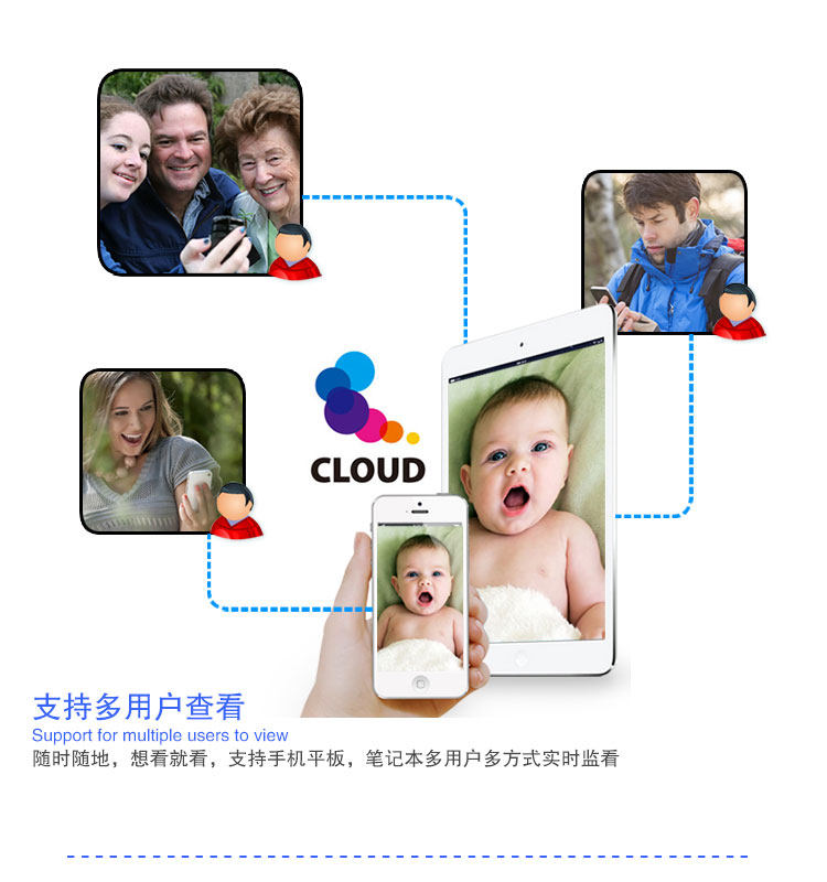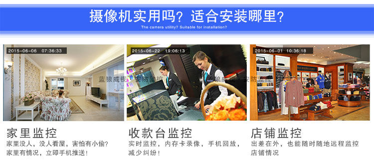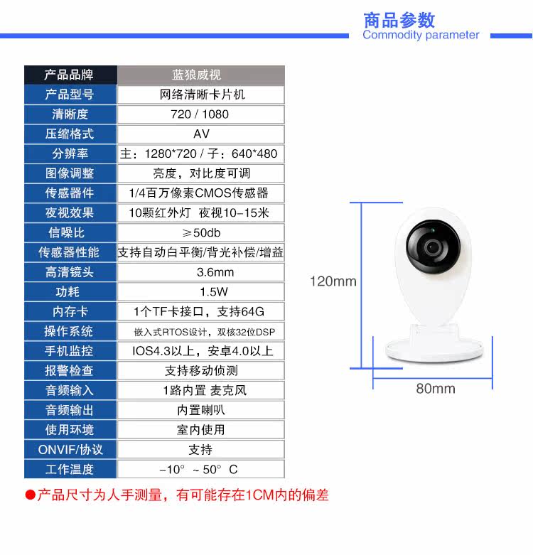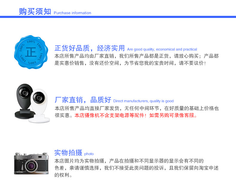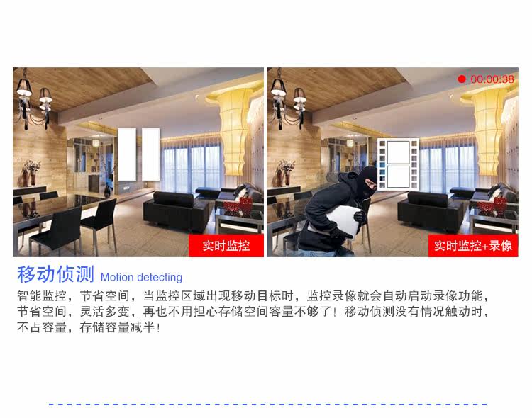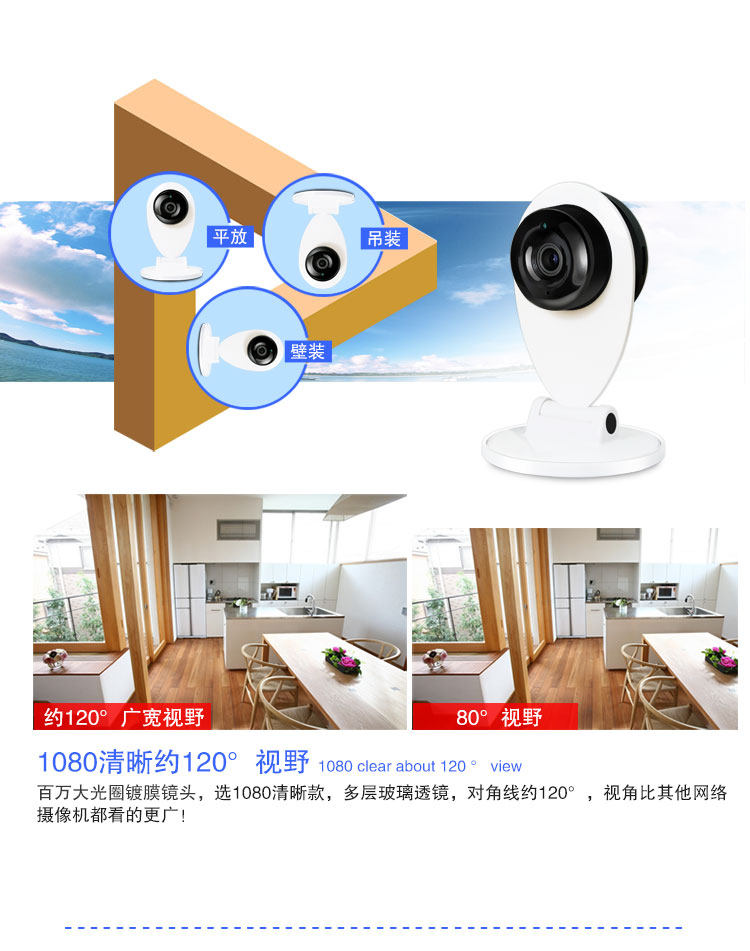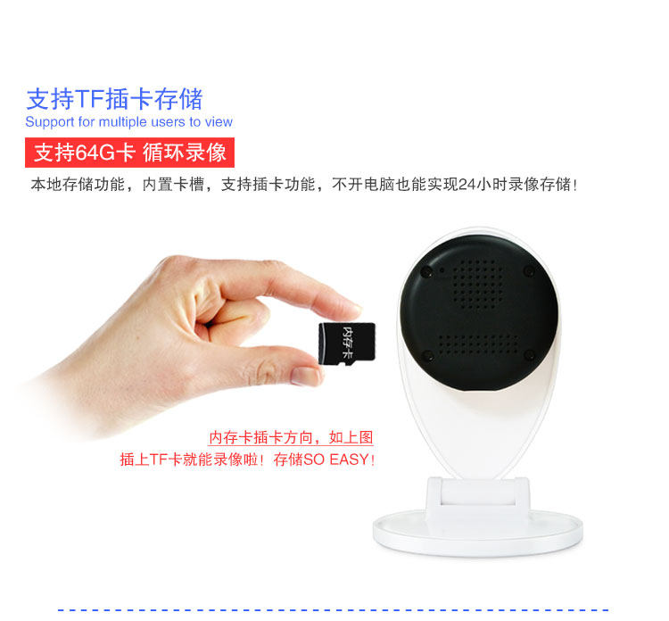 ![]() ![]() ![]() ——9大优势—— ①、无需繁琐配套,一台搞定,单机监控;(赠送安装底盘+电源+安装螺丝) ②、新机设置录像需要WIFI,再次即无需WIFI也可录像的,一键设置,单机录像;(需配TF内存卡,可在店内另购!) ③、现场拾音,室内无阻碍下可管约50平方; ④、10颗低功耗夜视红外灯,可管室内约20-40平方内; ⑤、内置天线,路由器到摄像头无阻隔约20-30米以内无线距离; ⑥、外插式TF内存卡,按需求录像时长,无需断电,随便更换内存卡,即插即用; ⑦、自带安装底盘,可装倒吊,壁装,立装; ⑧、手机回放录像更简单,无需电脑,操作简单; ⑨、安装多处,支持"手机集中”添加摄像头,集中监控... ![]() |