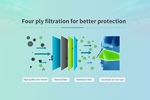 Four ply filtration for better protection: outer layer made with high quality non-woven, will not fade; second layer use thermal fiber, keep you warm in winner; third layer is meltblown filter, filter particle; humidity-absorbing and breathable of inner layer.