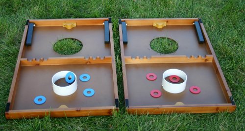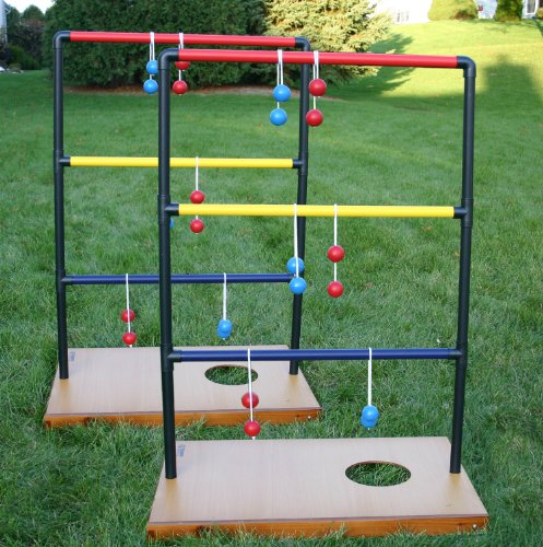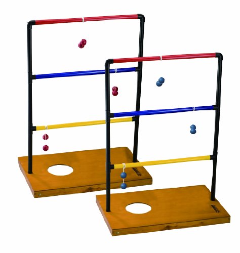 - Feature : Three-in-one outdoor game: play bag toss, ladder toss, and washer toss! / Includes two 28"L x 18.5" W wooden game platforms; one side for bag toss, reverse side for washer toss / Two 35"H x 24"W PVC ladders attach to platforms for ladder toss / Includes all game pieces for each game: eight 5" square toss bags (4 red, 4 blue), six rubber bolas (3 red, 3 blue), and six metal washers (3 red, 3 blue) / Game pieces and boards combine to fit inside the included carrying case with shoulder strap