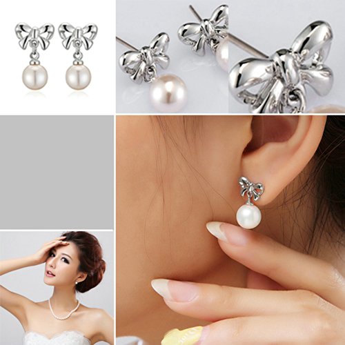 - Feature : This pair of earrings is cute and fashion designed. Pearl pendant with polished finish bowknot, three layers of 18K white gold plated, nickel free and tarnish free stud earrings. / The bowknots on this pearl pendant earrings signify the eternal bonds of love and friendship, making this pair of earrings an especially meaningful gift choice. / The earring size is 0.4''*0.8''. / Shipped out in an exquisite jewelry gift box. / One year warranty to ensure you a perfect shopping experience.