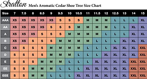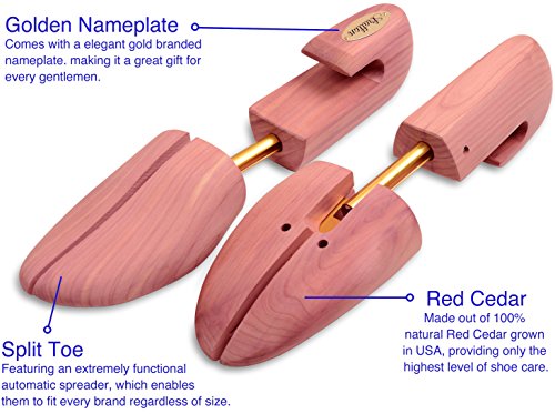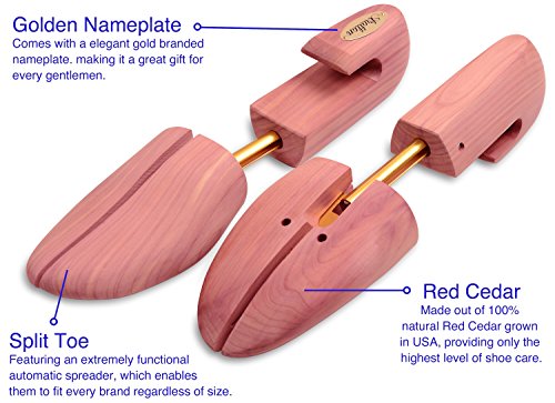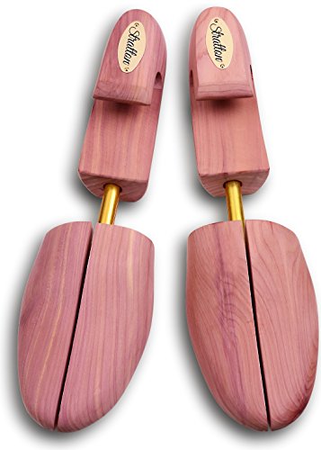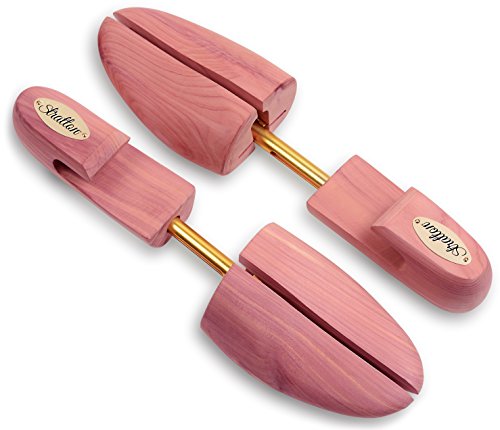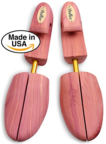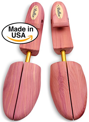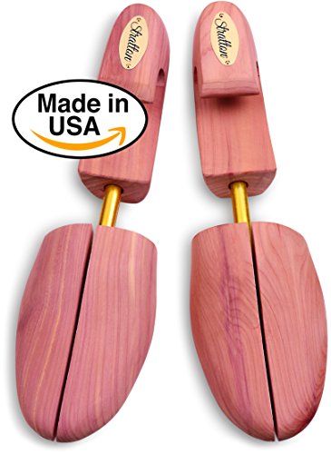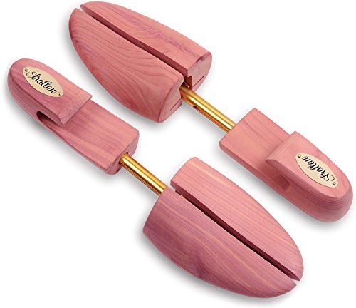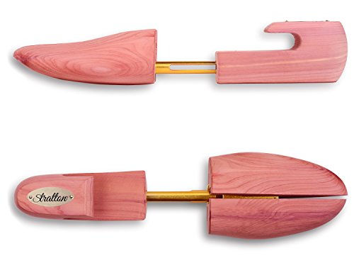 Product Description The Stratton Cedar Shoe Trees for men, are made out of aromatic cedar which is highly prized for all-natural benefits. Unfinished aromatic cedar absorbs moisture and deodorizes while the spring tension design maintains the original shoe shape. A shoe tree gently stretches shoes and helps them retain their natural shape. Shoe trees also make shoe cleaning easier, they allow shoes to dry in original shape, the cedar wood pulls damaging moisture, acids and salts from leather. Shoes last longer, look better, and feel more comfortable. The solid toe prevents cave-in and wrinkling of shoes. Are men's wood shoe trees also have an overhang heel which you can see from the side view. Made from cedar in a design that can be adjusted for length and toe width. Ideal for all styles of footwear and reduces odors while keeping the shape of your favorite shoes! Shoe trees also make a great gift, with its brass-plated metal hardware which adds an elegant touch. Fits, Allen Edmond, Cole Haan, Ecco, Rockport, Clarks, Bostonian, Steve Madden, Dockers, Stacy Adams, Johnston Murphy, Gucci, Prada, Bass, Salvatore Ferragamo, Calvin Klein, Bruno Magli, Florsheim, and every other shoe worthy of a shoe trees. Sold in pairs. Made in the USA. Manufactured and pack by Woodlore in Wisconsin. 0