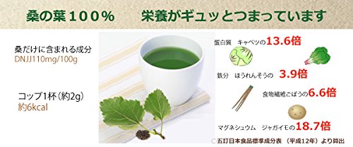 -. Feature : 放射能検査済み【有機JAS認定】栽培中はもちろん、種まきや植え付け前2年以上にわたって農薬や化学肥料を一切使っていない農地で栽培されていることを、JAS認定機関が検査し認定された事業者が農薬を使わず有機肥料だけで育てた桑の葉です。 / 【栄養成分表示100g中】DNJ:110mg タンパク質17.8g 脂質5.4g灰分13.9g 糖質18.4g 食物繊維 37.8g エネルギー269cal ナトリウム 16.1mg 鉄7.75mg / カルシウム2.69gマグネシウム 375mg遊離γーマミノ酪酸16mg 1-デオキシノジリマイシン50mg 水分6.7g / 青汁としてだけでなく、ホットケーキやヨーグルト、お味噌汁などに入れても。 / 食前か食事中にお召し上がりいただくのが、おすすめの食べ方です。