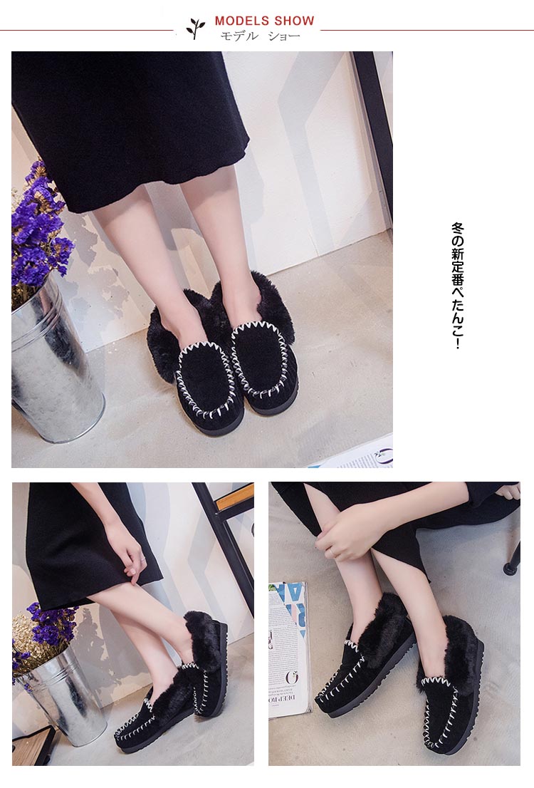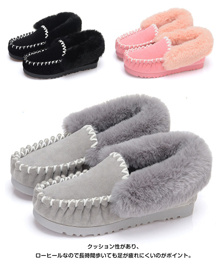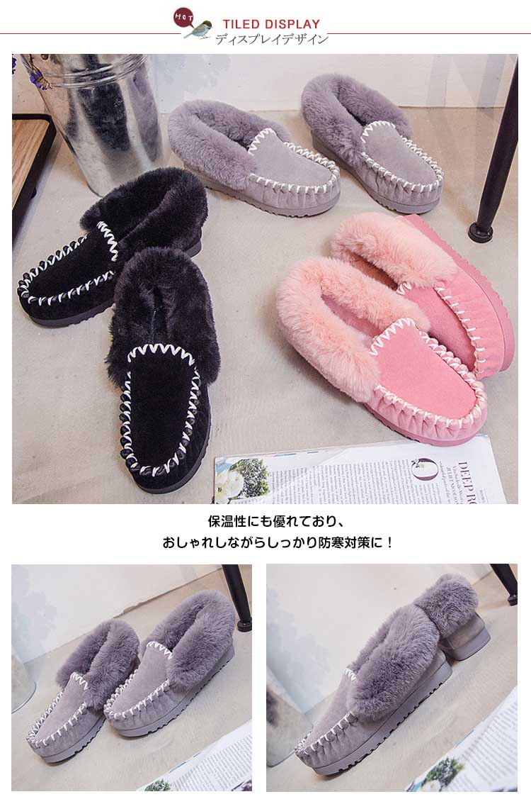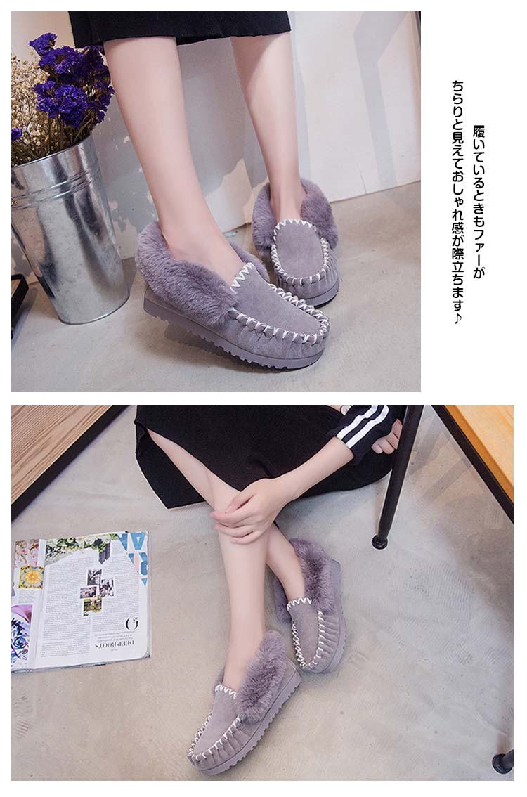 | 冬の新定番ぺたんこ!ふわっふわのボアを敷き詰めた歩きやすくコーディネートもしやすいムートンモカシンシューズが登場!履いているときもファーがちらりと見えておしゃれ感が際立ちます♪保温性にも優れており、おしゃれしながらしっかり防寒対策に!クッション性があり、ローヒールなので長時間歩いても足が疲れにくいのがポイント。 | |
