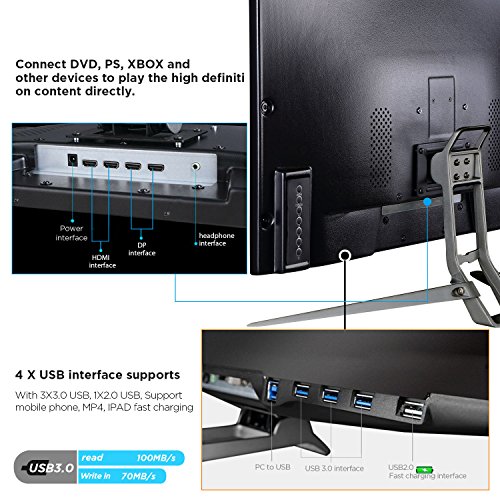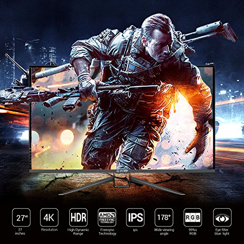 -. Feature : 【4K & Eye-care】: 27 inch 4K IPS 2160P UHD (3840x2160) display, 178 degree viewing angles, Eye-care technology with flicker-free backlighting and blue light filter minimizes eye fatigue. / 【HDR and 99%sRGB 】: Support HDR(High Dynamic Range) and 99%sRGB with accurate color reproduction. / 【Multiple Interfaces & Built-in Multimedia Stereo Speaker】: 2XHDMI ports, 3X 3.0USB Port, 1X 2.0USB Port, 2x 1.2DP port, 1x3.5mm audio jack, 2x5W built-in stereo speakers. / 【FreeSync and FPS/FTS Game Plus function】: With FreeSync* technology eliminates the tearing and stuttering, and designed for FPS/FTS games, it could help you perform better in any gaming modes. / 【Satisfaction Guaranteed】: 30 days free exchange and 13 months Warranty guarantee.