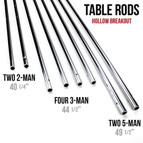 Studio : Brybelly Holdings, Inc Publisher : Brybelly Holdings, Inc Binding : Sports Product Description Rods are one of the most important (and expensive.) components of any foosball table, so make sure you choose yours wisely. These heavy-duty steel rods should do just fine. With a standard 5/8" diameter, these rods should fit almost any foosball table made by a popular manufacturer. You may be wondering what the difference is between solid and hollow rods. It's actually pretty significant, and will affect how your table plays. Solid rods are heavier, more sturdy, and will generally last much longer. You won't have to worry about solid rods bowing after years of heavy use. The general trade-off is ease of manipulation. Hollow rods like these are much easier to push, pull, and spin, which will make your foosball men feel a little more nimble, and are generally good choice for game rooms that see lots of young players. However, hollow rods can become warped through heavy inappropriate use, and might need to be removed and reshaped from time to time. Generally, with steel rods, the warp won't be significant and is easily corrected. 0