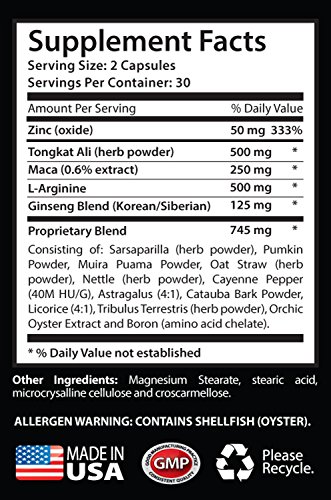-. Feature : TONGKAT ALI MALE LIBIDO: Since Tongkat Ali can increases levels of the testosterone, it has utility as a libido-enhancer or general male sexual aid. And second Tongkat Ali can be benefitial for general male libido enhancement. Males have been using Tongkat Ali supplements for libido enhancement for centuries ever since it was first discovered as a plant in Southeast Asia. / ZINC TESTOSTERONE SUPPLEMENTS: Zinc supplementation can boost both total and free testosterone levels. In a study of elite wrestlers, the men took 3 mg/kg/day of zinc sulfate for four weeks along with their normal diet. Levels of total and free testosterone were significantly higher after rest and exhausting exercise following zinc supplementation than they were before supplementation. / MACA LIBIDO CAPSULES: While research is sparse on its effectiveness for being a sure-fire aphrodisiac, some studies indicate maca's possible use in the bedroom. Not surP.R.Isingly, maca root has a centuries-long reputation for being a powerful aphrodisiac. / PANAX GINSENG SEX: Ginseng is one of the top product which can be beneficial for boosting sexual energy, libido and improving sex strength. Yang ginseng or Korean red ginseng are welly known as the provider of creative drive and physical strength. / GUARANTEED 100% SATISFACTION! MADE IN U.S.A. No Additives or Fillers, Zero Artificial Ingredients. In addition, our formula is made in FDA approved facility under GMP standards.