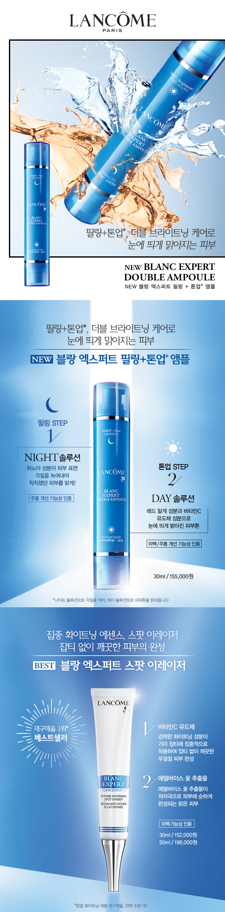 STEP 1. 나이트 솔루션 : 퀴노아 성분이 피부 표면의 각질을 녹여내어 칙칙했던 피부를 맑게! (주름 개선 기능성) STEP 2. 데이 솔루션 : 레드 알게 성분과 비타민 C 유도체 성분으로 눈에 띄게 밝아진 피부톤! (미백 기능성 + 주름 개선 기능성)